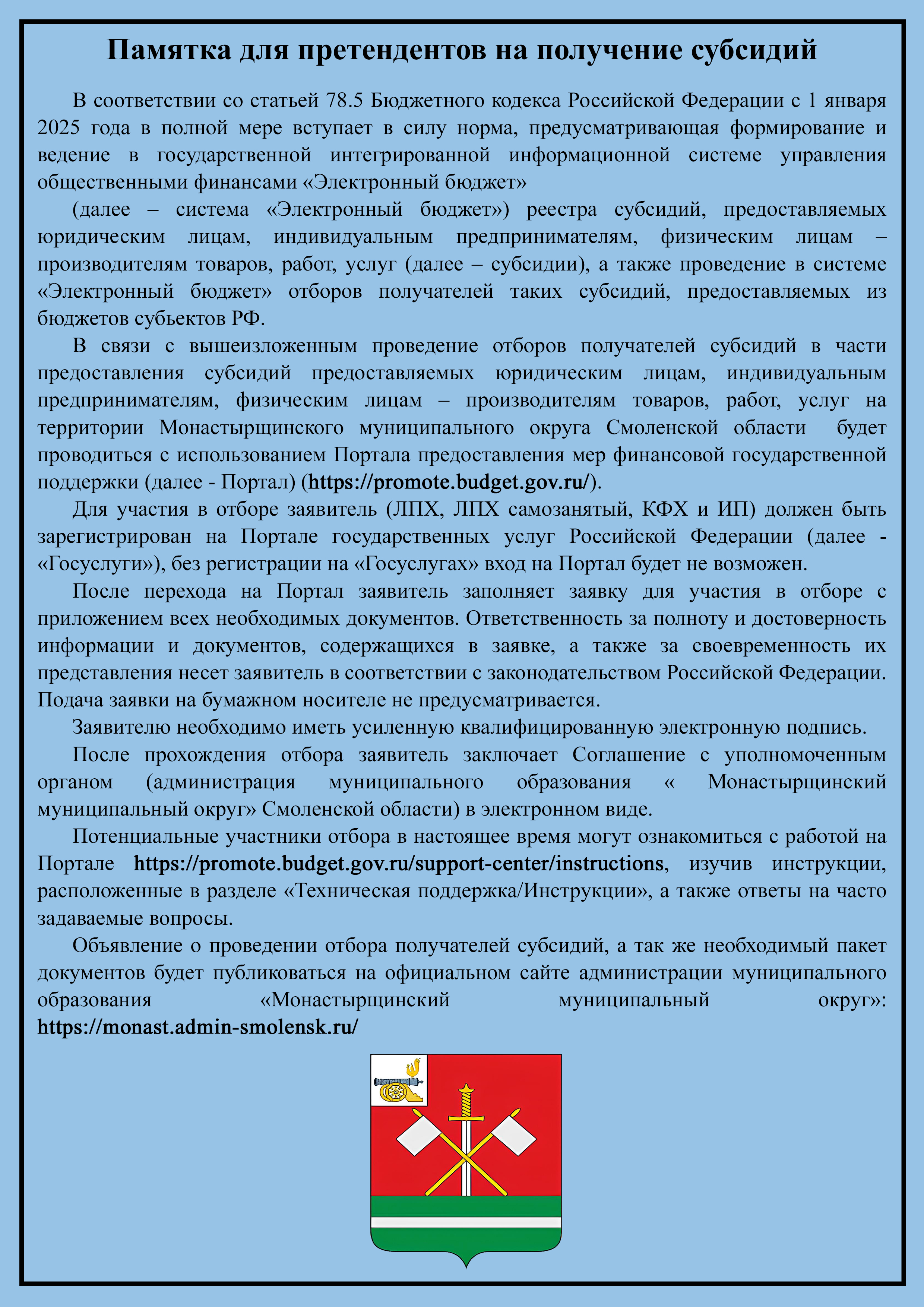 Администрация муниципального образования «Монастырщинский муниципальный округ» Смоленской области сообщает о начале приема документов для участия в отборе на предоставление в 2025 году грантов в рамках реализации Областной государственной программы «Экономическое развитие Смоленской области, включая создание благоприятного предпринимательского и инвестиционного климата» за счет средств областного бюджета и бюджета муниципального образования «Монастырщинский муниципальный округ» Смоленской области в рамках реализации муниципальной программы «Создание благоприятного предпринимательского климата на территории муниципального образования «Монастырщинский муниципальный округ» Смоленской области», в соответствии с Порядком, утвержденным постановлением Администрации муниципального образования «Монастырщинский муниципальный округ» Смоленской области от 10.02.2025 № 96( в редакции постановлений от 15.05.2025 № 459, от 11.08.2025 № 756).