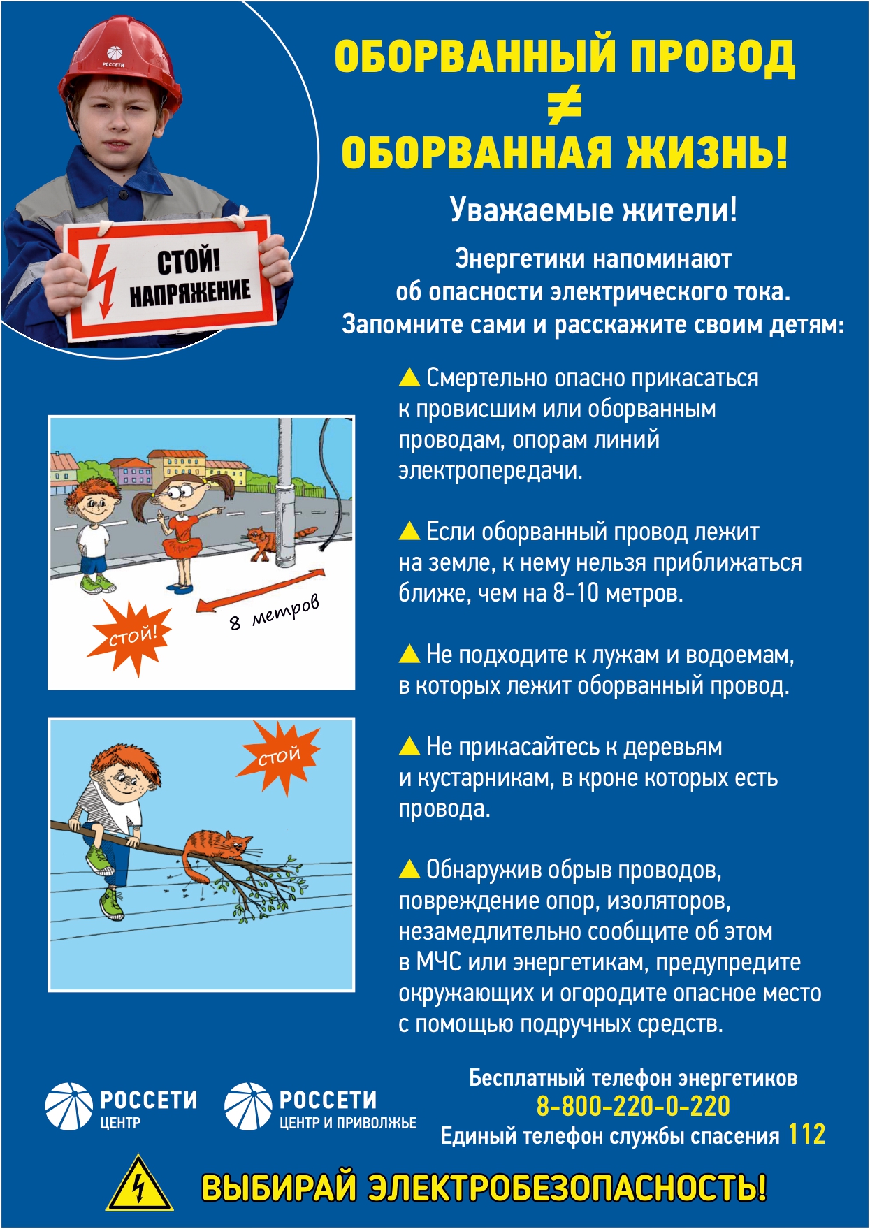 При обнаружении обрыва проводов, искрения, повреждения опор, изоляторов, незакрытых или поврежденных дверей трансформаторных подстанций или электрических щитов необходимо незамедлительно сообщить об этом по телефону горячей линии Россети «Светлая линия 220» 8-800-220-0-220 (звонок бесплатный, круглосуточно) или в МЧС.