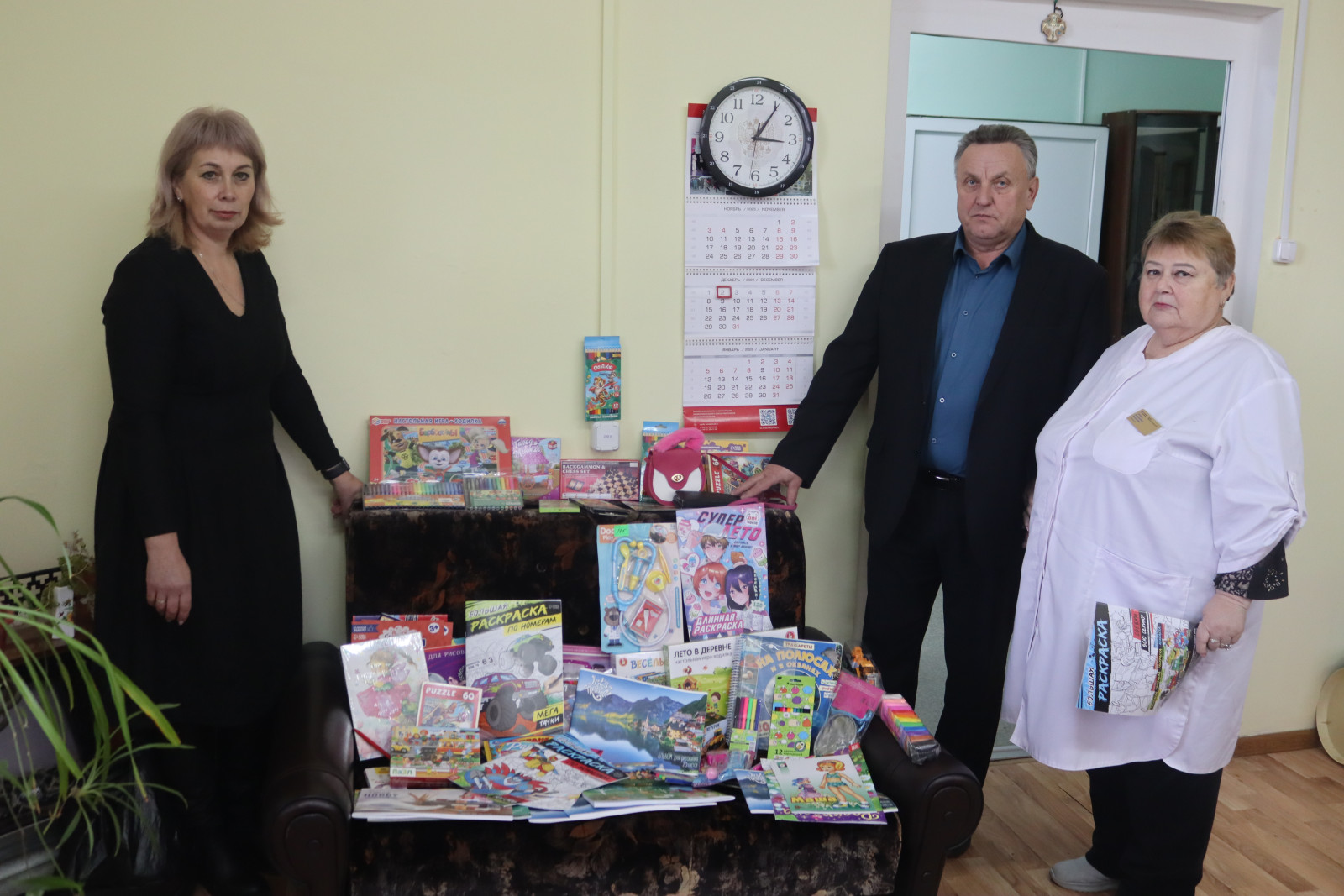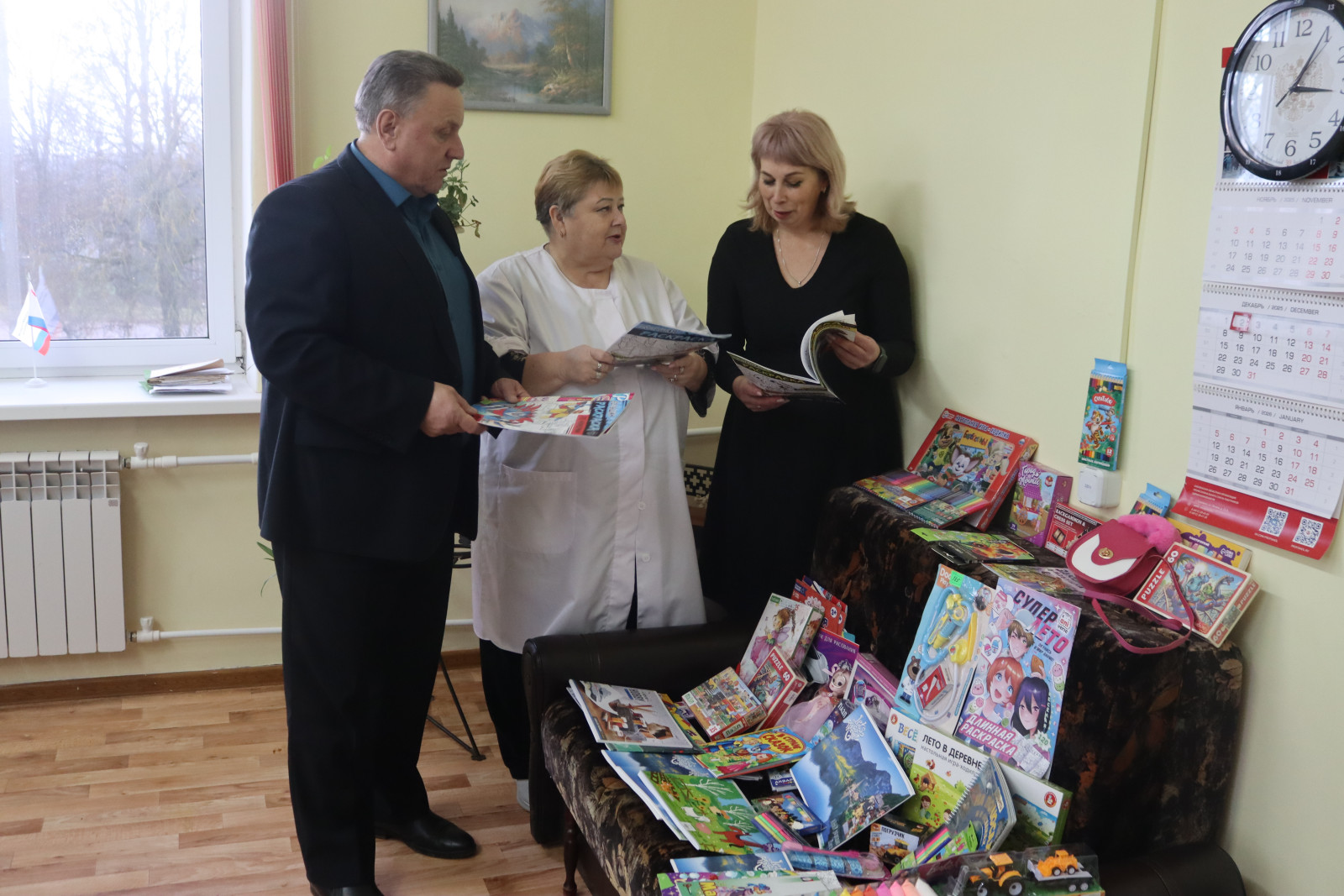 Новые игрушки, раскраски, карандаши, фломастеры для маленьких пациентов детского отделения Монастырщинской центральной районной больницы передали Глава округа Виктор Борисович Титов и исполнительный секретарь местного отделения партии «Единая Россия» Ольга Владимировна Ходотаева.