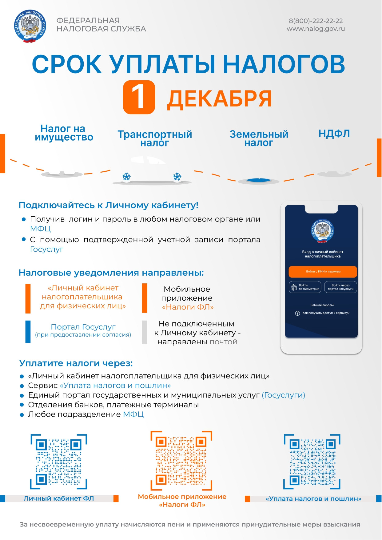 Налоговое уведомление за налоговый период 2024 года должно быть исполнено (налоги в нём оплачены) не позднее 1 декабря 2025 года, за исключением случаев переноса сроков уплаты налогов на имущество на основании постановлений Правительства Российской Федерации (см., например, постановления Правительства РФ от 04.09.2024 № 1222 «О мерах поддержки лицам, осуществляющим деятельность на отдельных территориях Курской области», от 07.12.2024 № 1735 «О мерах поддержки жителям отдельных территорий Курской области, не осуществляющим предпринимательскую деятельность»).