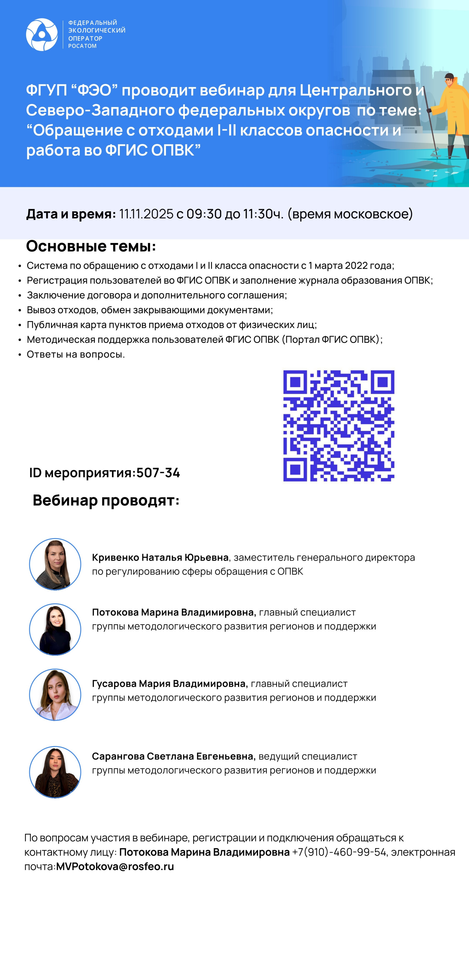 11 ноября 2025 г. с 9:30 до 11:30 состоится обучающий вебинар для юридических лиц и индивидуальных предпринимателей, в том числе органов местного самоуправления, управляющих компаний, организующих пункты приема (места накопления) отходов I и II классов опасности от физических лиц, осуществляющих деятельность на территории Центрального федерального округа. Вебинар проводится на безвозмездной основе в формате видео-конференц-связи в коммуникационном пространстве Атом Спэйс ВКС (ИВА).
