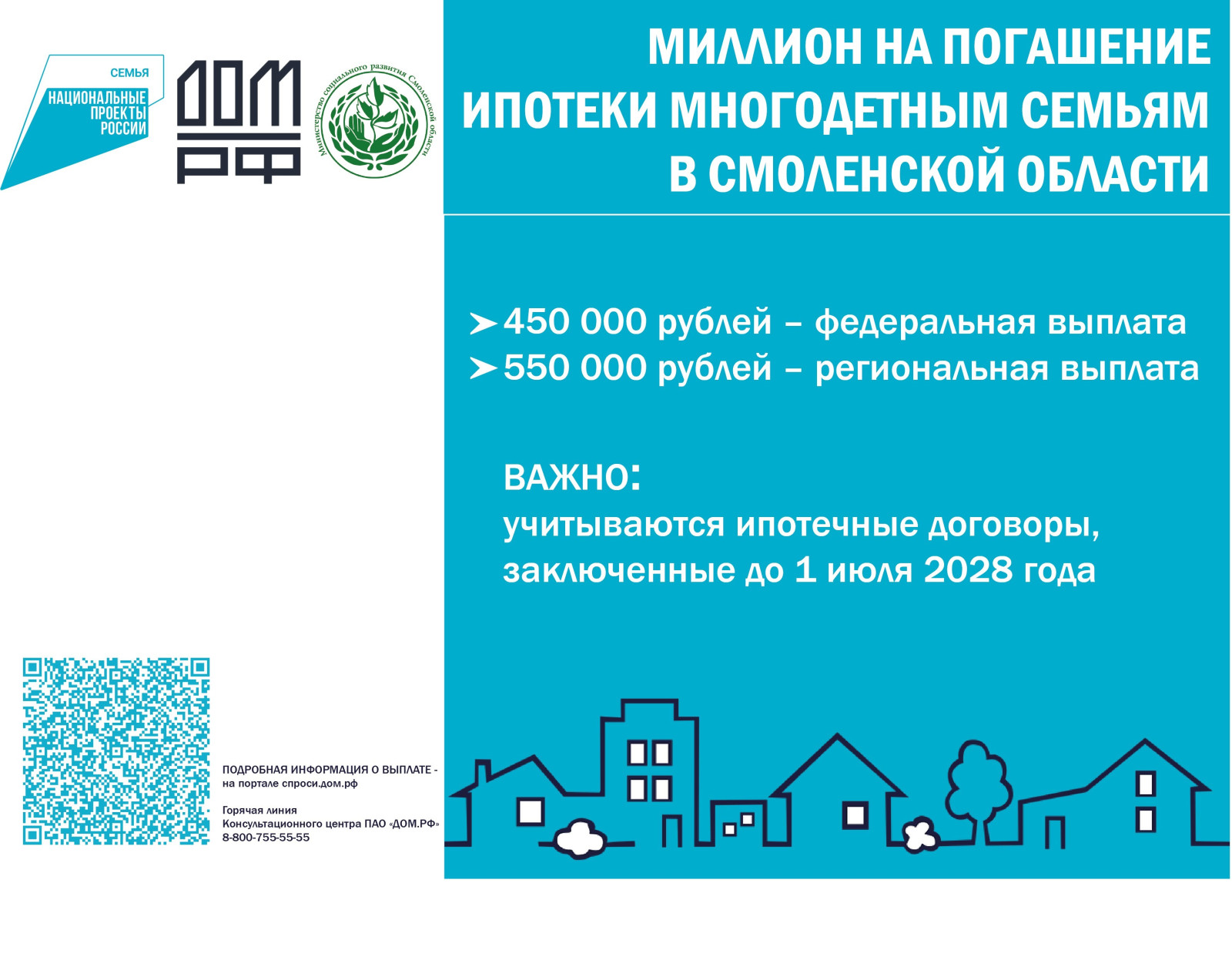 1. В рамках нацпроекта «Семья» на территории Смоленской области предоставляется выплата на полное или частичное погашение обязательств по ипотечному жилищному кредиту.