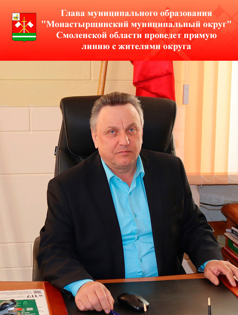 26 сентября в 11:00 на официальной странице Администрации муниципального образования «Монастырщинский муниципальный округ» Смоленской области vk.com/monast67?from=groups состоится прямой эфир с Главой муниципального образования «Монастырщинский муниципальный округ» Смоленской области Виктором Борисовичем Титовым. В ходе прямого эфира вы сможете задать вопросы о волнующих вас проблемах.